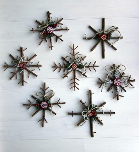 Il procedimento per fare la ghirlanda è semplice. Innanzitutto formate con due rami una X, successivamente fermateli al centro con un filo in modo da mantenere la forma. Aggiungete e fissate poi un terzo ramo, con questo andrete a creare una stella a sei punte. Ultimo passaggio per creare il fiocco di neve sta nel tagliare dei rami in tre pezzi più piccoli e fissarli alla forma base. Per appendere la ghirlanda un semplice filo è sufficiente.