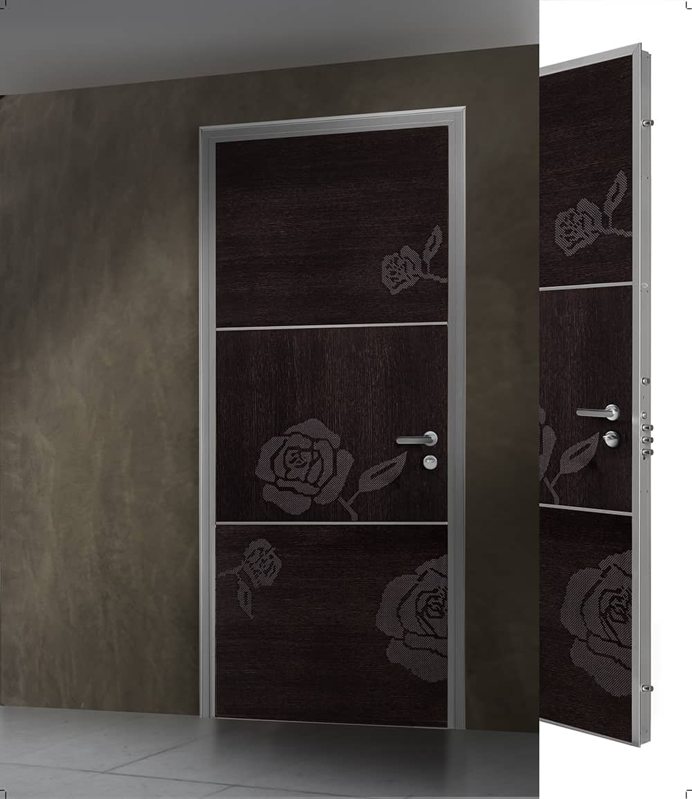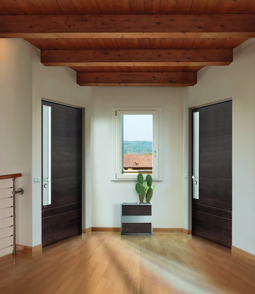 I montanti di FLAT sono in alluminio e contengono una fascia in legno nella stessa finitura del pannello. Le finiture disponibili per la serie Flat porte blindate sono : pannelli in legno varie essenze e laccati lucidi / opachi colori RAL